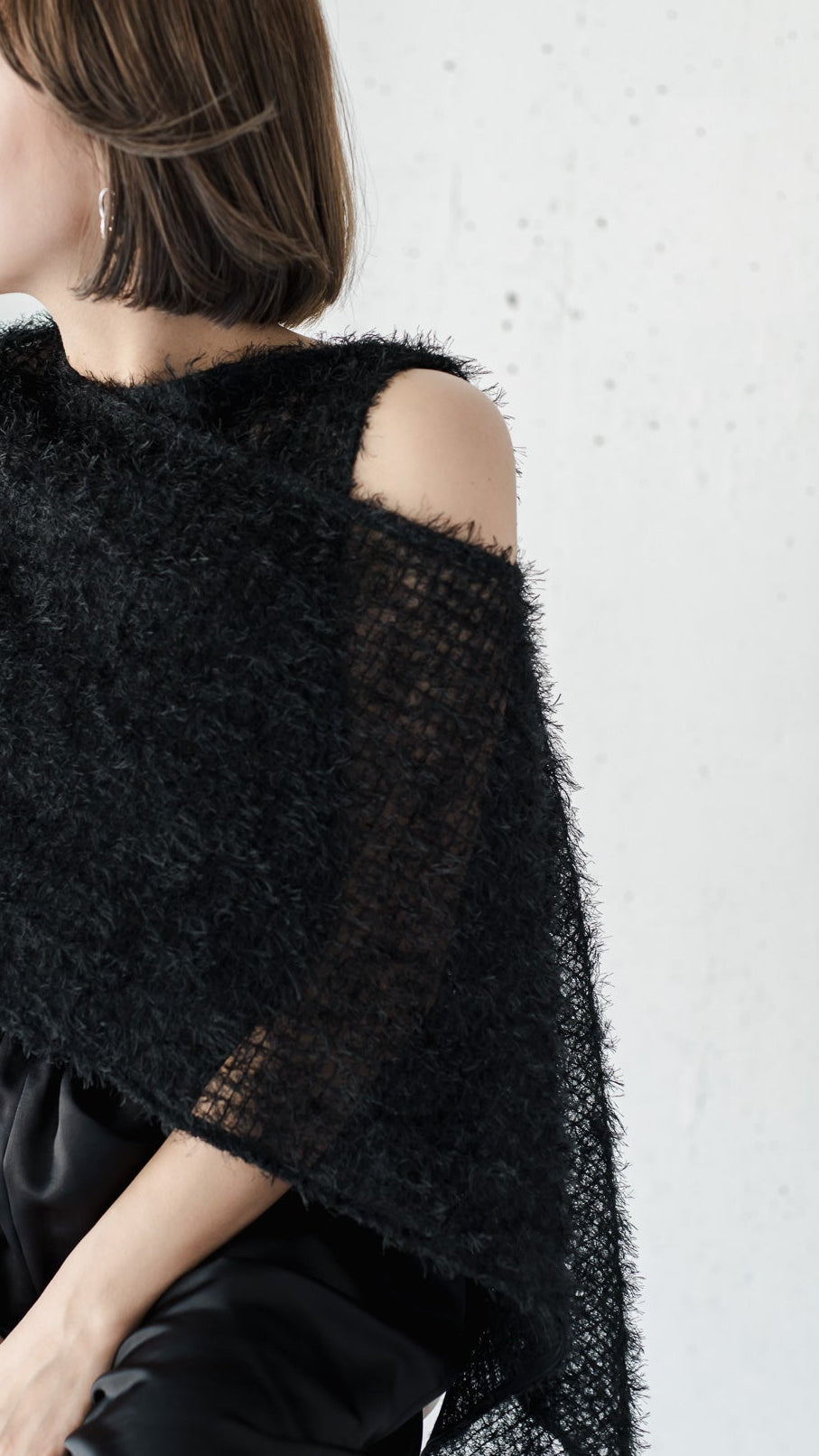 同素材でお作りしているFeather Veil Blouseと合わせていただくと、より華やかなスタイリングをお楽しみいただけます。またお手持ちのトップスにレイヤードしていただくことで体型カバーや冷房対策としてもお使いいただけるとても万能なアイテムとなっております。